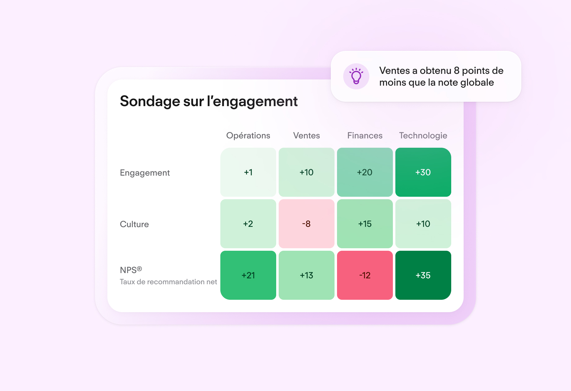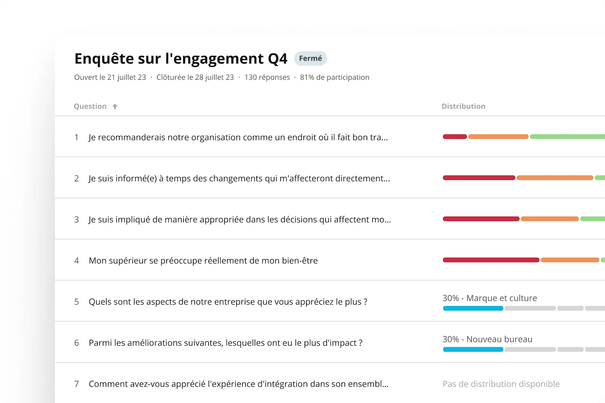 Lancez votre sondage en quelques minutes et explorez les résultats fondés sur des données scientifiques pour révéler les véritables moteurs d’engagement.